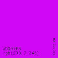 Цвет #D007F5 в цветовой модели RGB обозначается тремя октетами (208, 7, 245) в десятичном формате и #D007F5 в шестнадцатиричном (hex) формате, которые являются интенсивностью красного 208 (hex D0), интенсивность зелёного 7 (hex 07) и интенсивность синего 245 (hex F5).
