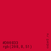Цвет #D00833 в цветовой модели RGB обозначается тремя октетами (208, 8, 51) в десятичном формате и #D00833 в шестнадцатиричном (hex) формате, которые являются интенсивностью красного 208 (hex D0), интенсивность зелёного 8 (hex 08) и интенсивность синего 51 (hex 33).