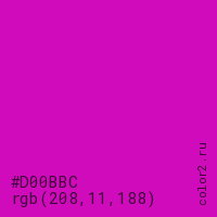 Цвет #D00BBC в цветовой модели RGB обозначается тремя октетами (208, 11, 188) в десятичном формате и #D00BBC в шестнадцатиричном (hex) формате, которые являются интенсивностью красного 208 (hex D0), интенсивность зелёного 11 (hex 0B) и интенсивность синего 188 (hex BC).