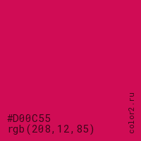 Цвет #D00C55 в цветовой модели RGB обозначается тремя октетами (208, 12, 85) в десятичном формате и #D00C55 в шестнадцатиричном (hex) формате, которые являются интенсивностью красного 208 (hex D0), интенсивность зелёного 12 (hex 0C) и интенсивность синего 85 (hex 55).