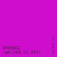 Цвет #D00DCC в цветовой модели RGB обозначается тремя октетами (208, 13, 204) в десятичном формате и #D00DCC в шестнадцатиричном (hex) формате, которые являются интенсивностью красного 208 (hex D0), интенсивность зелёного 13 (hex 0D) и интенсивность синего 204 (hex CC).