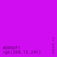Цвет #D00DF1 в цветовой модели RGB обозначается тремя октетами (208, 13, 241) в десятичном формате и #D00DF1 в шестнадцатиричном (hex) формате, которые являются интенсивностью красного 208 (hex D0), интенсивность зелёного 13 (hex 0D) и интенсивность синего 241 (hex F1).