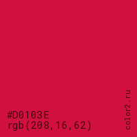 Цвет #D0103E в цветовой модели RGB обозначается тремя октетами (208, 16, 62) в десятичном формате и #D0103E в шестнадцатиричном (hex) формате, которые являются интенсивностью красного 208 (hex D0), интенсивность зелёного 16 (hex 10) и интенсивность синего 62 (hex 3E).