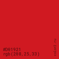 Цвет #D01921 в цветовой модели RGB обозначается тремя октетами (208, 25, 33) в десятичном формате и #D01921 в шестнадцатиричном (hex) формате, которые являются интенсивностью красного 208 (hex D0), интенсивность зелёного 25 (hex 19) и интенсивность синего 33 (hex 21).