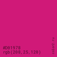Цвет #D01978 в цветовой модели RGB обозначается тремя октетами (208, 25, 120) в десятичном формате и #D01978 в шестнадцатиричном (hex) формате, которые являются интенсивностью красного 208 (hex D0), интенсивность зелёного 25 (hex 19) и интенсивность синего 120 (hex 78).