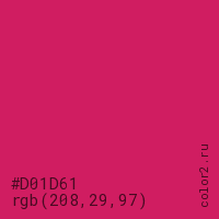 Цвет #D01D61 в цветовой модели RGB обозначается тремя октетами (208, 29, 97) в десятичном формате и #D01D61 в шестнадцатиричном (hex) формате, которые являются интенсивностью красного 208 (hex D0), интенсивность зелёного 29 (hex 1D) и интенсивность синего 97 (hex 61).