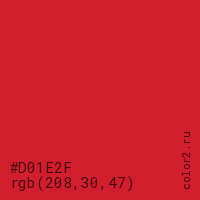 Цвет #D01E2F в цветовой модели RGB обозначается тремя октетами (208, 30, 47) в десятичном формате и #D01E2F в шестнадцатиричном (hex) формате, которые являются интенсивностью красного 208 (hex D0), интенсивность зелёного 30 (hex 1E) и интенсивность синего 47 (hex 2F).