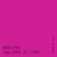 Цвет #D01F95 в цветовой модели RGB обозначается тремя октетами (208, 31, 149) в десятичном формате и #D01F95 в шестнадцатиричном (hex) формате, которые являются интенсивностью красного 208 (hex D0), интенсивность зелёного 31 (hex 1F) и интенсивность синего 149 (hex 95).
