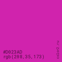 Цвет #D023AD в цветовой модели RGB обозначается тремя октетами (208, 35, 173) в десятичном формате и #D023AD в шестнадцатиричном (hex) формате, которые являются интенсивностью красного 208 (hex D0), интенсивность зелёного 35 (hex 23) и интенсивность синего 173 (hex AD).