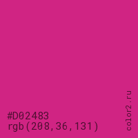 Цвет #D02483 в цветовой модели RGB обозначается тремя октетами (208, 36, 131) в десятичном формате и #D02483 в шестнадцатиричном (hex) формате, которые являются интенсивностью красного 208 (hex D0), интенсивность зелёного 36 (hex 24) и интенсивность синего 131 (hex 83).