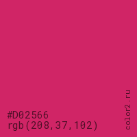 Цвет #D02566 в цветовой модели RGB обозначается тремя октетами (208, 37, 102) в десятичном формате и #D02566 в шестнадцатиричном (hex) формате, которые являются интенсивностью красного 208 (hex D0), интенсивность зелёного 37 (hex 25) и интенсивность синего 102 (hex 66).