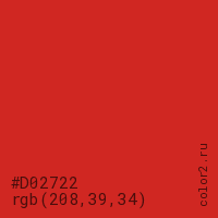 Цвет #D02722 в цветовой модели RGB обозначается тремя октетами (208, 39, 34) в десятичном формате и #D02722 в шестнадцатиричном (hex) формате, которые являются интенсивностью красного 208 (hex D0), интенсивность зелёного 39 (hex 27) и интенсивность синего 34 (hex 22).
