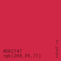 Цвет #D02747 в цветовой модели RGB обозначается тремя октетами (208, 39, 71) в десятичном формате и #D02747 в шестнадцатиричном (hex) формате, которые являются интенсивностью красного 208 (hex D0), интенсивность зелёного 39 (hex 27) и интенсивность синего 71 (hex 47).