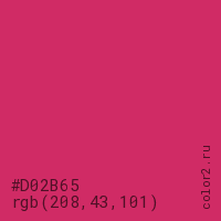 Цвет #D02B65 в цветовой модели RGB обозначается тремя октетами (208, 43, 101) в десятичном формате и #D02B65 в шестнадцатиричном (hex) формате, которые являются интенсивностью красного 208 (hex D0), интенсивность зелёного 43 (hex 2B) и интенсивность синего 101 (hex 65).