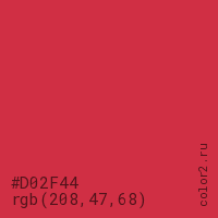 Цвет #D02F44 в цветовой модели RGB обозначается тремя октетами (208, 47, 68) в десятичном формате и #D02F44 в шестнадцатиричном (hex) формате, которые являются интенсивностью красного 208 (hex D0), интенсивность зелёного 47 (hex 2F) и интенсивность синего 68 (hex 44).