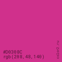 Цвет #D0308C в цветовой модели RGB обозначается тремя октетами (208, 48, 140) в десятичном формате и #D0308C в шестнадцатиричном (hex) формате, которые являются интенсивностью красного 208 (hex D0), интенсивность зелёного 48 (hex 30) и интенсивность синего 140 (hex 8C).