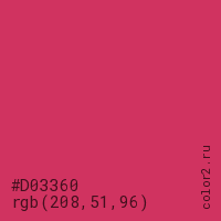 Цвет #D03360 в цветовой модели RGB обозначается тремя октетами (208, 51, 96) в десятичном формате и #D03360 в шестнадцатиричном (hex) формате, которые являются интенсивностью красного 208 (hex D0), интенсивность зелёного 51 (hex 33) и интенсивность синего 96 (hex 60).