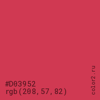 Цвет #D03952 в цветовой модели RGB обозначается тремя октетами (208, 57, 82) в десятичном формате и #D03952 в шестнадцатиричном (hex) формате, которые являются интенсивностью красного 208 (hex D0), интенсивность зелёного 57 (hex 39) и интенсивность синего 82 (hex 52).