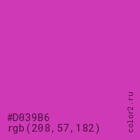 Цвет #D039B6 в цветовой модели RGB обозначается тремя октетами (208, 57, 182) в десятичном формате и #D039B6 в шестнадцатиричном (hex) формате, которые являются интенсивностью красного 208 (hex D0), интенсивность зелёного 57 (hex 39) и интенсивность синего 182 (hex B6).
