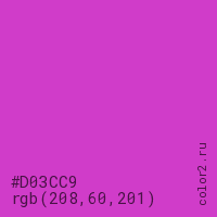 Цвет #D03CC9 в цветовой модели RGB обозначается тремя октетами (208, 60, 201) в десятичном формате и #D03CC9 в шестнадцатиричном (hex) формате, которые являются интенсивностью красного 208 (hex D0), интенсивность зелёного 60 (hex 3C) и интенсивность синего 201 (hex C9).