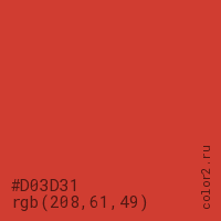 Цвет #D03D31 в цветовой модели RGB обозначается тремя октетами (208, 61, 49) в десятичном формате и #D03D31 в шестнадцатиричном (hex) формате, которые являются интенсивностью красного 208 (hex D0), интенсивность зелёного 61 (hex 3D) и интенсивность синего 49 (hex 31).