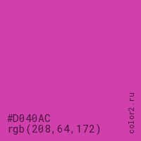 Цвет #D040AC в цветовой модели RGB обозначается тремя октетами (208, 64, 172) в десятичном формате и #D040AC в шестнадцатиричном (hex) формате, которые являются интенсивностью красного 208 (hex D0), интенсивность зелёного 64 (hex 40) и интенсивность синего 172 (hex AC).