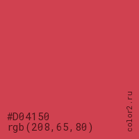 Цвет #D04150 в цветовой модели RGB обозначается тремя октетами (208, 65, 80) в десятичном формате и #D04150 в шестнадцатиричном (hex) формате, которые являются интенсивностью красного 208 (hex D0), интенсивность зелёного 65 (hex 41) и интенсивность синего 80 (hex 50).