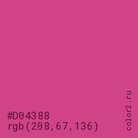 Цвет #D04388 в цветовой модели RGB обозначается тремя октетами (208, 67, 136) в десятичном формате и #D04388 в шестнадцатиричном (hex) формате, которые являются интенсивностью красного 208 (hex D0), интенсивность зелёного 67 (hex 43) и интенсивность синего 136 (hex 88).