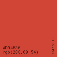 Цвет #D04536 в цветовой модели RGB обозначается тремя октетами (208, 69, 54) в десятичном формате и #D04536 в шестнадцатиричном (hex) формате, которые являются интенсивностью красного 208 (hex D0), интенсивность зелёного 69 (hex 45) и интенсивность синего 54 (hex 36).