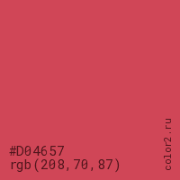 Цвет #D04657 в цветовой модели RGB обозначается тремя октетами (208, 70, 87) в десятичном формате и #D04657 в шестнадцатиричном (hex) формате, которые являются интенсивностью красного 208 (hex D0), интенсивность зелёного 70 (hex 46) и интенсивность синего 87 (hex 57).