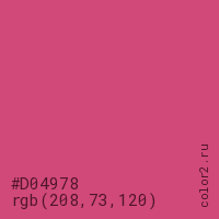 Цвет #D04978 в цветовой модели RGB обозначается тремя октетами (208, 73, 120) в десятичном формате и #D04978 в шестнадцатиричном (hex) формате, которые являются интенсивностью красного 208 (hex D0), интенсивность зелёного 73 (hex 49) и интенсивность синего 120 (hex 78).