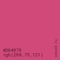 Цвет #D04979 в цветовой модели RGB обозначается тремя октетами (208, 73, 121) в десятичном формате и #D04979 в шестнадцатиричном (hex) формате, которые являются интенсивностью красного 208 (hex D0), интенсивность зелёного 73 (hex 49) и интенсивность синего 121 (hex 79).