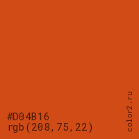 Цвет #D04B16 в цветовой модели RGB обозначается тремя октетами (208, 75, 22) в десятичном формате и #D04B16 в шестнадцатиричном (hex) формате, которые являются интенсивностью красного 208 (hex D0), интенсивность зелёного 75 (hex 4B) и интенсивность синего 22 (hex 16).