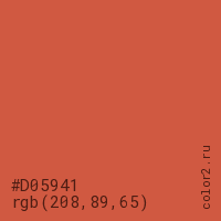 Цвет #D05941 в цветовой модели RGB обозначается тремя октетами (208, 89, 65) в десятичном формате и #D05941 в шестнадцатиричном (hex) формате, которые являются интенсивностью красного 208 (hex D0), интенсивность зелёного 89 (hex 59) и интенсивность синего 65 (hex 41).