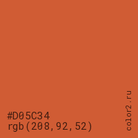 Цвет #D05C34 в цветовой модели RGB обозначается тремя октетами (208, 92, 52) в десятичном формате и #D05C34 в шестнадцатиричном (hex) формате, которые являются интенсивностью красного 208 (hex D0), интенсивность зелёного 92 (hex 5C) и интенсивность синего 52 (hex 34).