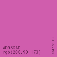 Цвет #D05DAD в цветовой модели RGB обозначается тремя октетами (208, 93, 173) в десятичном формате и #D05DAD в шестнадцатиричном (hex) формате, которые являются интенсивностью красного 208 (hex D0), интенсивность зелёного 93 (hex 5D) и интенсивность синего 173 (hex AD).