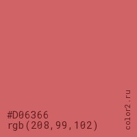 Цвет #D06366 в цветовой модели RGB обозначается тремя октетами (208, 99, 102) в десятичном формате и #D06366 в шестнадцатиричном (hex) формате, которые являются интенсивностью красного 208 (hex D0), интенсивность зелёного 99 (hex 63) и интенсивность синего 102 (hex 66).