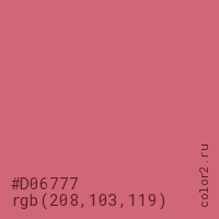 Цвет #D06777 в цветовой модели RGB обозначается тремя октетами (208, 103, 119) в десятичном формате и #D06777 в шестнадцатиричном (hex) формате, которые являются интенсивностью красного 208 (hex D0), интенсивность зелёного 103 (hex 67) и интенсивность синего 119 (hex 77).
