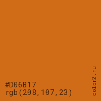 Цвет #D06B17 в цветовой модели RGB обозначается тремя октетами (208, 107, 23) в десятичном формате и #D06B17 в шестнадцатиричном (hex) формате, которые являются интенсивностью красного 208 (hex D0), интенсивность зелёного 107 (hex 6B) и интенсивность синего 23 (hex 17).