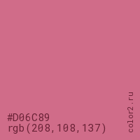 Цвет #D06C89 в цветовой модели RGB обозначается тремя октетами (208, 108, 137) в десятичном формате и #D06C89 в шестнадцатиричном (hex) формате, которые являются интенсивностью красного 208 (hex D0), интенсивность зелёного 108 (hex 6C) и интенсивность синего 137 (hex 89).