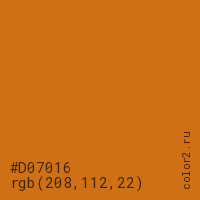 Цвет #D07016 в цветовой модели RGB обозначается тремя октетами (208, 112, 22) в десятичном формате и #D07016 в шестнадцатиричном (hex) формате, которые являются интенсивностью красного 208 (hex D0), интенсивность зелёного 112 (hex 70) и интенсивность синего 22 (hex 16).