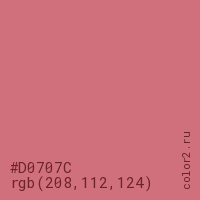 Цвет #D0707C в цветовой модели RGB обозначается тремя октетами (208, 112, 124) в десятичном формате и #D0707C в шестнадцатиричном (hex) формате, которые являются интенсивностью красного 208 (hex D0), интенсивность зелёного 112 (hex 70) и интенсивность синего 124 (hex 7C).