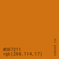Цвет #D07211 в цветовой модели RGB обозначается тремя октетами (208, 114, 17) в десятичном формате и #D07211 в шестнадцатиричном (hex) формате, которые являются интенсивностью красного 208 (hex D0), интенсивность зелёного 114 (hex 72) и интенсивность синего 17 (hex 11).