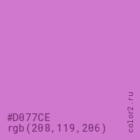 Цвет #D077CE в цветовой модели RGB обозначается тремя октетами (208, 119, 206) в десятичном формате и #D077CE в шестнадцатиричном (hex) формате, которые являются интенсивностью красного 208 (hex D0), интенсивность зелёного 119 (hex 77) и интенсивность синего 206 (hex CE).