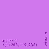 Цвет #D077EE в цветовой модели RGB обозначается тремя октетами (208, 119, 238) в десятичном формате и #D077EE в шестнадцатиричном (hex) формате, которые являются интенсивностью красного 208 (hex D0), интенсивность зелёного 119 (hex 77) и интенсивность синего 238 (hex EE).