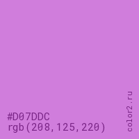 Цвет #D07DDC в цветовой модели RGB обозначается тремя октетами (208, 125, 220) в десятичном формате и #D07DDC в шестнадцатиричном (hex) формате, которые являются интенсивностью красного 208 (hex D0), интенсивность зелёного 125 (hex 7D) и интенсивность синего 220 (hex DC).
