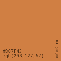 Цвет #D07F43 в цветовой модели RGB обозначается тремя октетами (208, 127, 67) в десятичном формате и #D07F43 в шестнадцатиричном (hex) формате, которые являются интенсивностью красного 208 (hex D0), интенсивность зелёного 127 (hex 7F) и интенсивность синего 67 (hex 43).