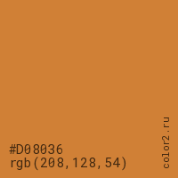 Цвет #D08036 в цветовой модели RGB обозначается тремя октетами (208, 128, 54) в десятичном формате и #D08036 в шестнадцатиричном (hex) формате, которые являются интенсивностью красного 208 (hex D0), интенсивность зелёного 128 (hex 80) и интенсивность синего 54 (hex 36).