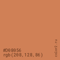 Цвет #D08056 в цветовой модели RGB обозначается тремя октетами (208, 128, 86) в десятичном формате и #D08056 в шестнадцатиричном (hex) формате, которые являются интенсивностью красного 208 (hex D0), интенсивность зелёного 128 (hex 80) и интенсивность синего 86 (hex 56).
