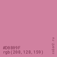 Цвет #D0809F в цветовой модели RGB обозначается тремя октетами (208, 128, 159) в десятичном формате и #D0809F в шестнадцатиричном (hex) формате, которые являются интенсивностью красного 208 (hex D0), интенсивность зелёного 128 (hex 80) и интенсивность синего 159 (hex 9F).